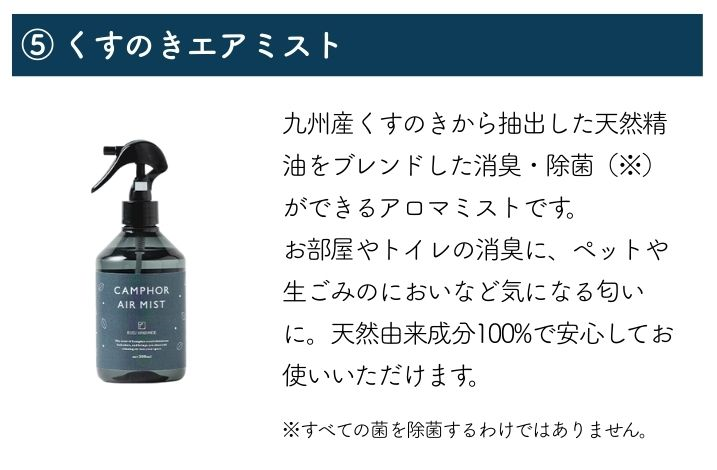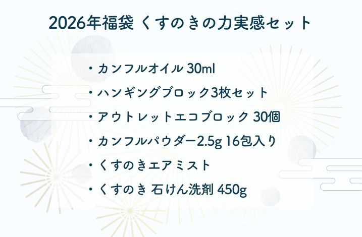 【2026年福袋】くすのきの力実感セット通常:約10,000円相当→特別価格:5,000円(税込)**************************************【販売期間】2025年12月8日~2026年1月5日【お届け開始】2026年1月1日以降**************************************※福袋は予約商品となります。通常商品と一緒にご注文された場合は福袋の発送とあわせてから、1回のご注文単位での出荷とさせて頂きます。【内容物】・カンフルオイル 30ml・ハンギングブロック3枚セット・アウトレットエコブロック 30個・カンフルパウダー2.5g 16包入り・くすのきエアミスト・くすのき 石けん洗剤 450g1年のはじまりに、くすのきのさわやかな香りと自然の力をまるごと楽しめる特別なセットをご用意しました。防虫・消臭・リフレッシュ…くすのきが持つ魅力を、暮らしのいろいろなシーンで実感していただけます。全てセット内容が見えておりますので、内容を吟味してお選びいただけます。玄関・クローゼット・お部屋のリフレッシュから、お洗濯やお掃除まで。暮らしの中で“くすのきの力”をしっかり味わえる、ボリュームいっぱいの福袋です。・いろんな商品を試してみたい・お得に手に入れたい・KUSU HANDMADEデビューしてみたいという方は、ぜひこの機会にお試しください。