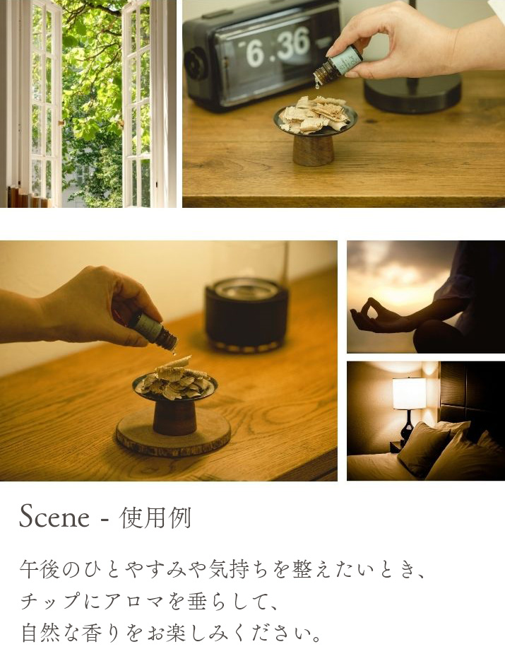 私を導く3つの森の香り心を整え、やすらぎに身を委ね、感情を手放し、本来の私へ。─ アロマウッドチップ ─くすのきの木部をカンナで削ったアロマディフーザーです。オイルを垂らしてお使いください。