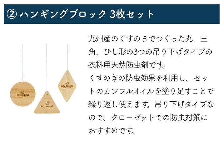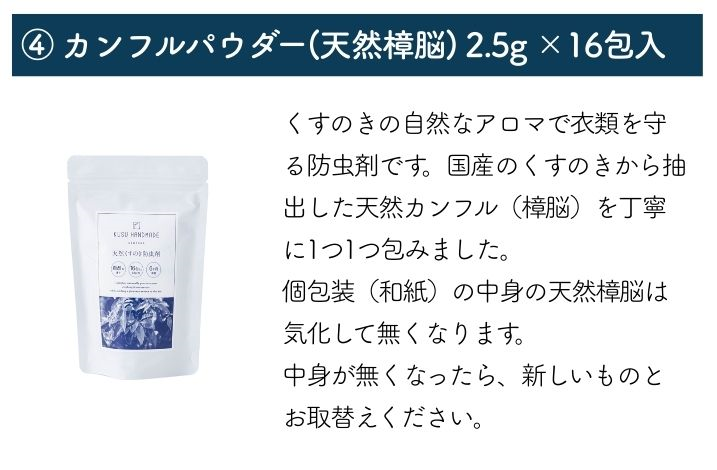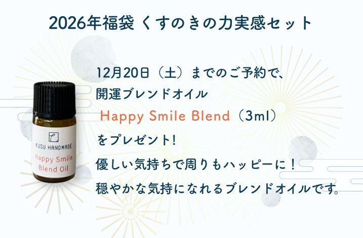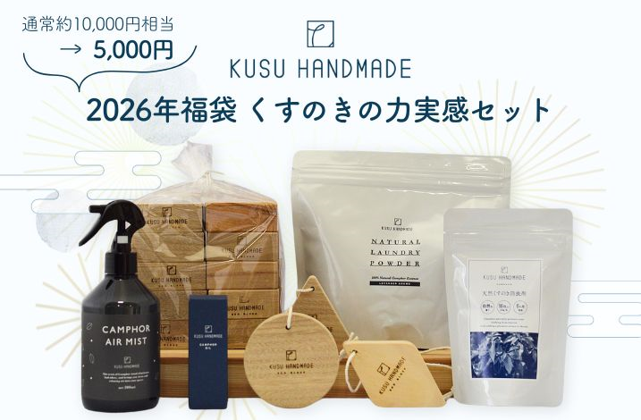 【2026年福袋】くすのきの力実感セット通常:約10,000円相当→特別価格:5,000円(税込)**************************************【販売期間】2025年12月8日~2026年1月5日【お届け開始】2026年1月1日以降**************************************※福袋は予約商品となります。通常商品と一緒にご注文された場合は福袋の発送とあわせてから、1回のご注文単位での出荷とさせて頂きます。【内容物】・カンフルオイル 30ml・ハンギングブロック3枚セット・アウトレットエコブロック 30個・カンフルパウダー2.5g 16包入り・くすのきエアミスト・くすのき 石けん洗剤 450g1年のはじまりに、くすのきのさわやかな香りと自然の力をまるごと楽しめる特別なセットをご用意しました。防虫・消臭・リフレッシュ…くすのきが持つ魅力を、暮らしのいろいろなシーンで実感していただけます。全てセット内容が見えておりますので、内容を吟味してお選びいただけます。玄関・クローゼット・お部屋のリフレッシュから、お洗濯やお掃除まで。暮らしの中で“くすのきの力”をしっかり味わえる、ボリュームいっぱいの福袋です。・いろんな商品を試してみたい・お得に手に入れたい・KUSU HANDMADEデビューしてみたいという方は、ぜひこの機会にお試しください。